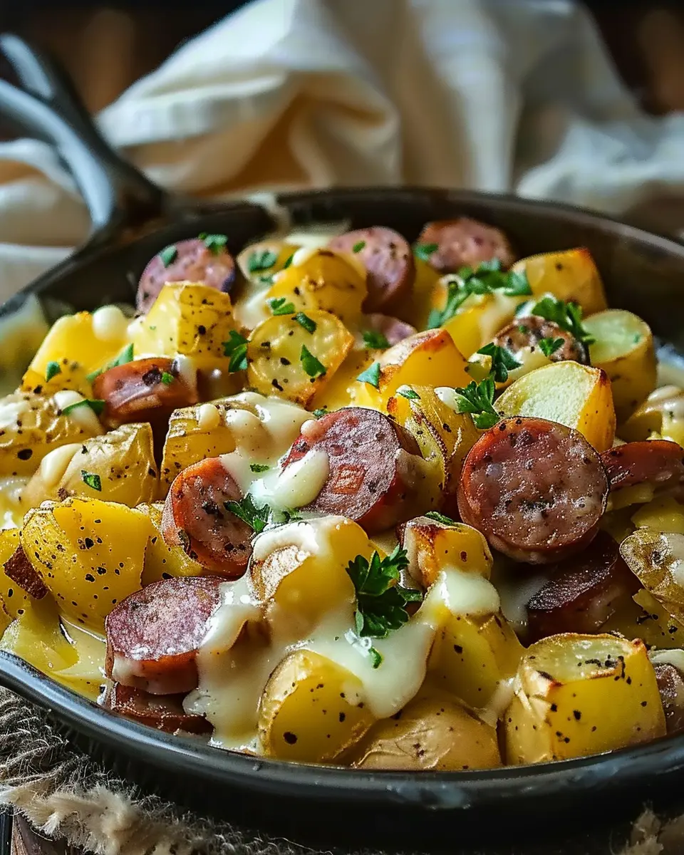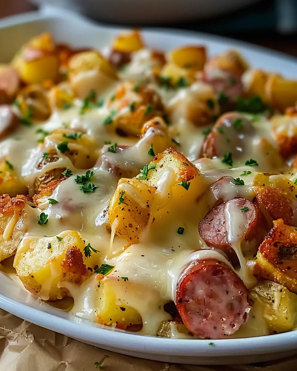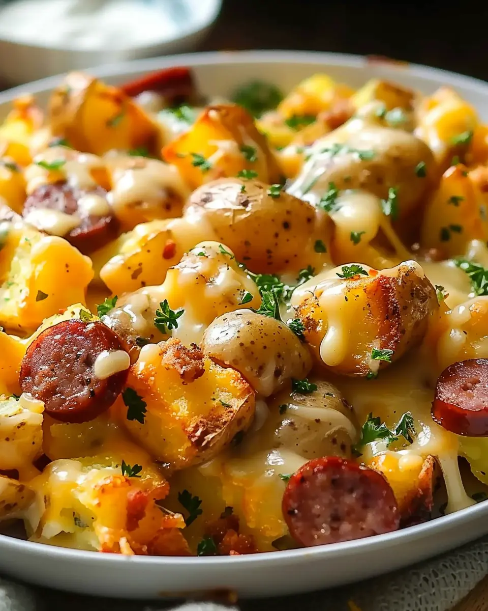 A comforting blend of cheesy potatoes and savory smoked sausage for a delightful dinner.