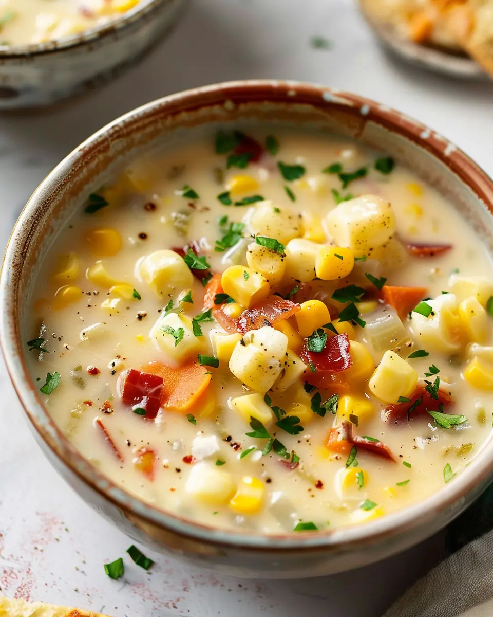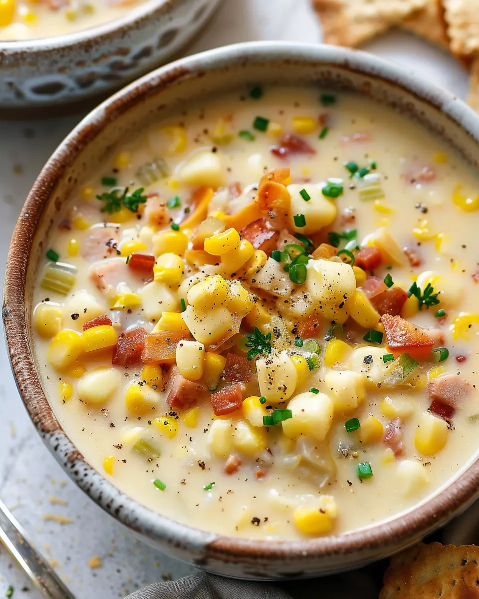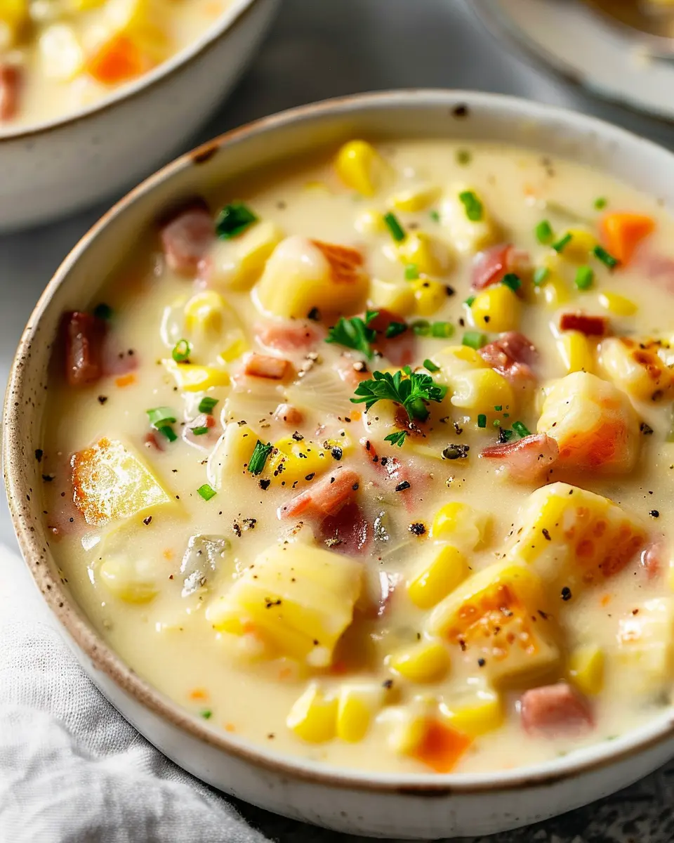 Delight in this creamy corn chowder enriched with turkey bacon and chicken ham, perfect for a comforting meal.