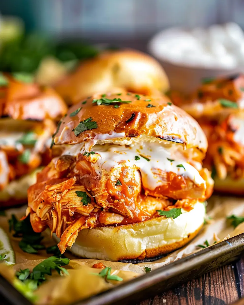 • Generously scoop the buffalo chicken mixture onto each bun’s bottom half, ensuring they are evenly filled.