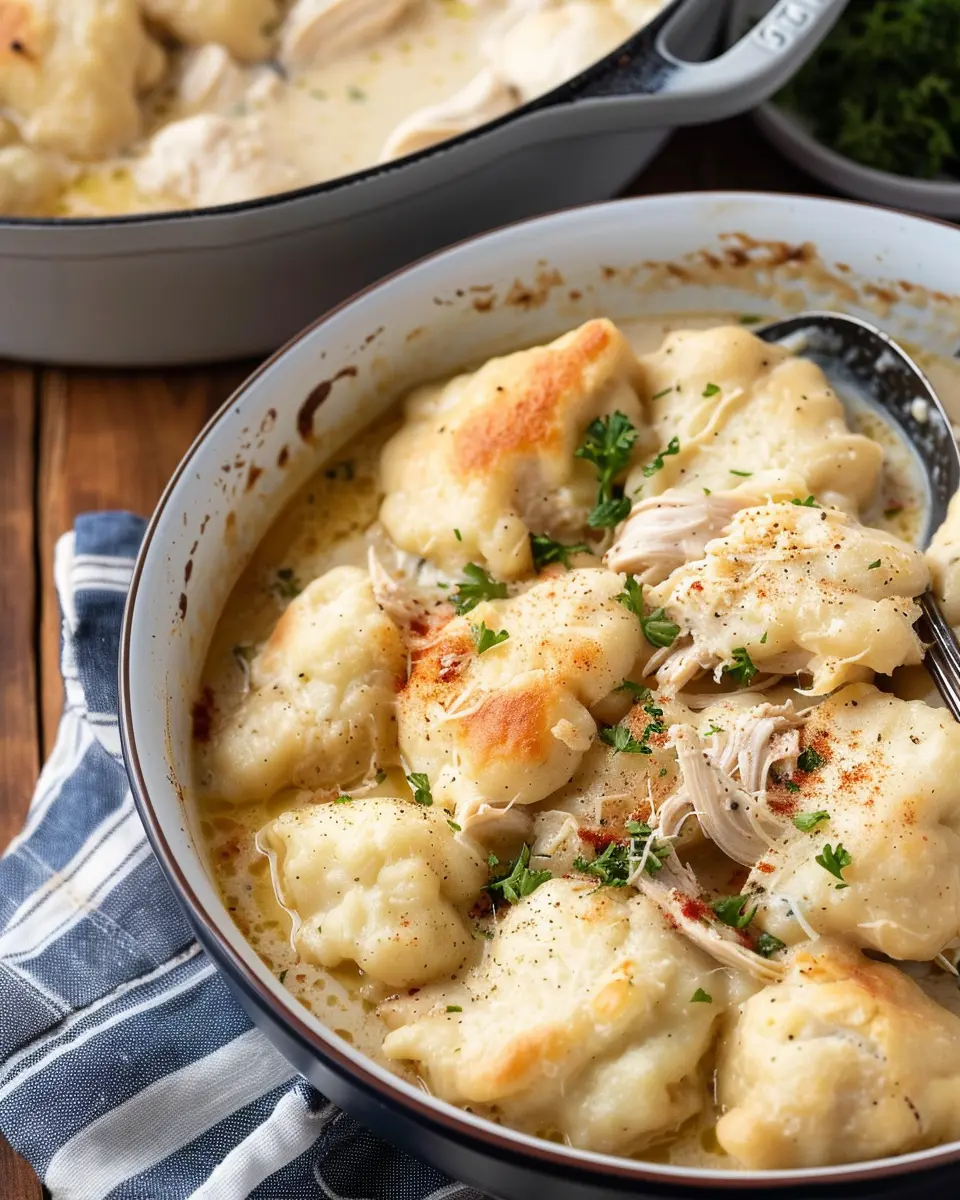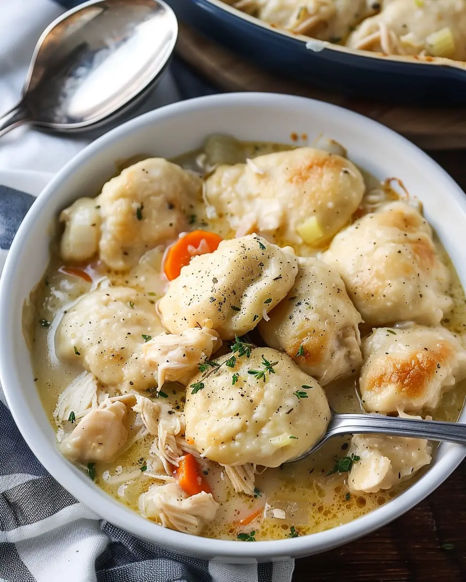 Imagine cold evenings where a pot of creamy chicken and fluffy dumplings waits to wrap you in comfort. Plus, with everyday ingredients and minimal prep time, you can whip it up on a moment’s notice. So why not gather your ingredients and give this recipe a try? It’s a delightful way to bring everyone together around the dinner table.