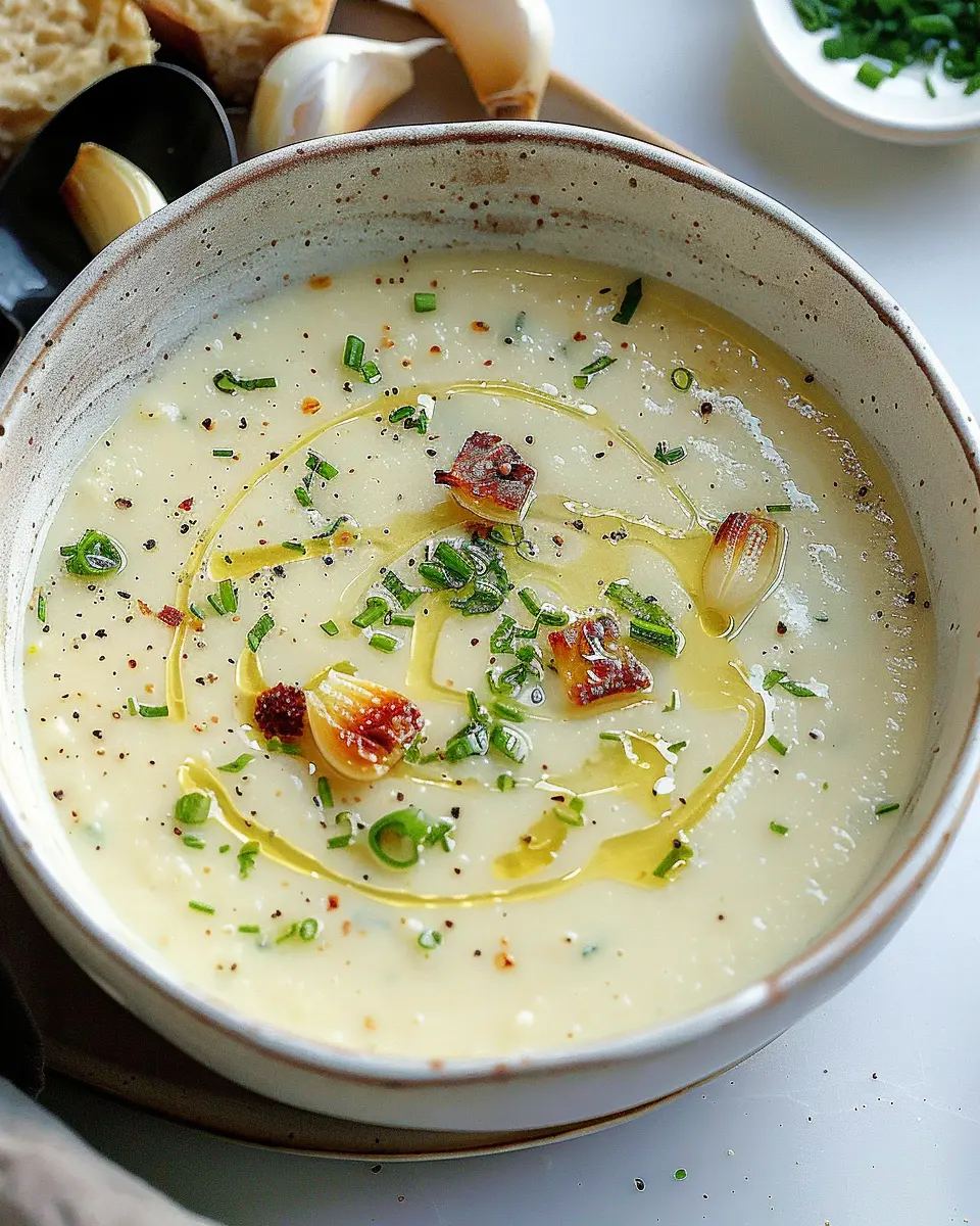 A comforting roasted garlic soup that is easy to make and perfect for chilly days.