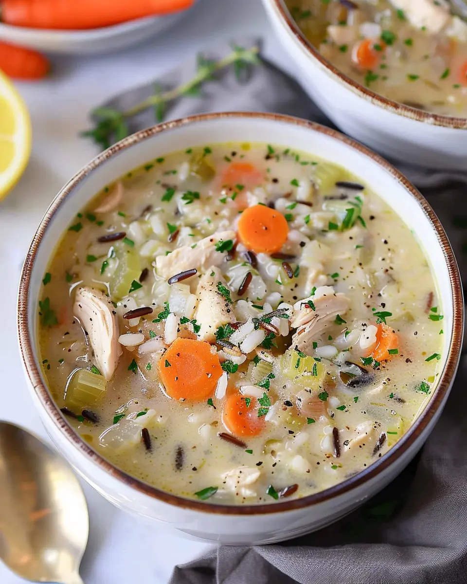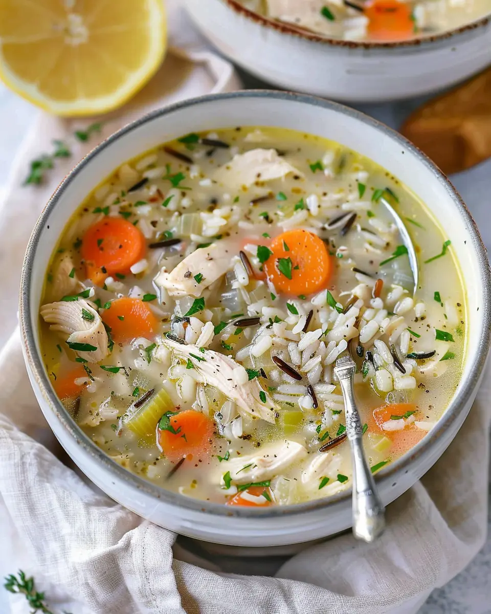 A hearty and comforting soup that combines tender chicken, wild rice, and zesty lemon flavor for a nourishing meal.