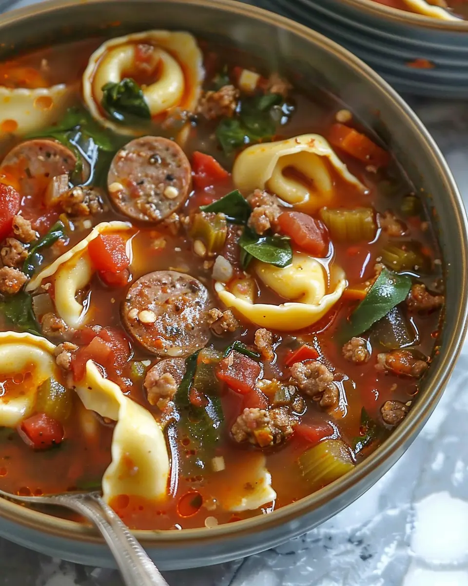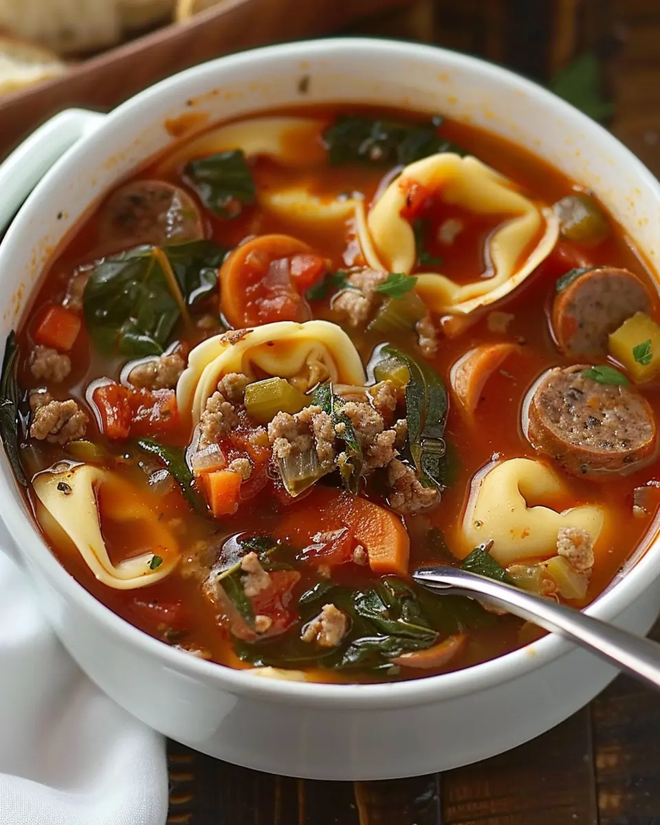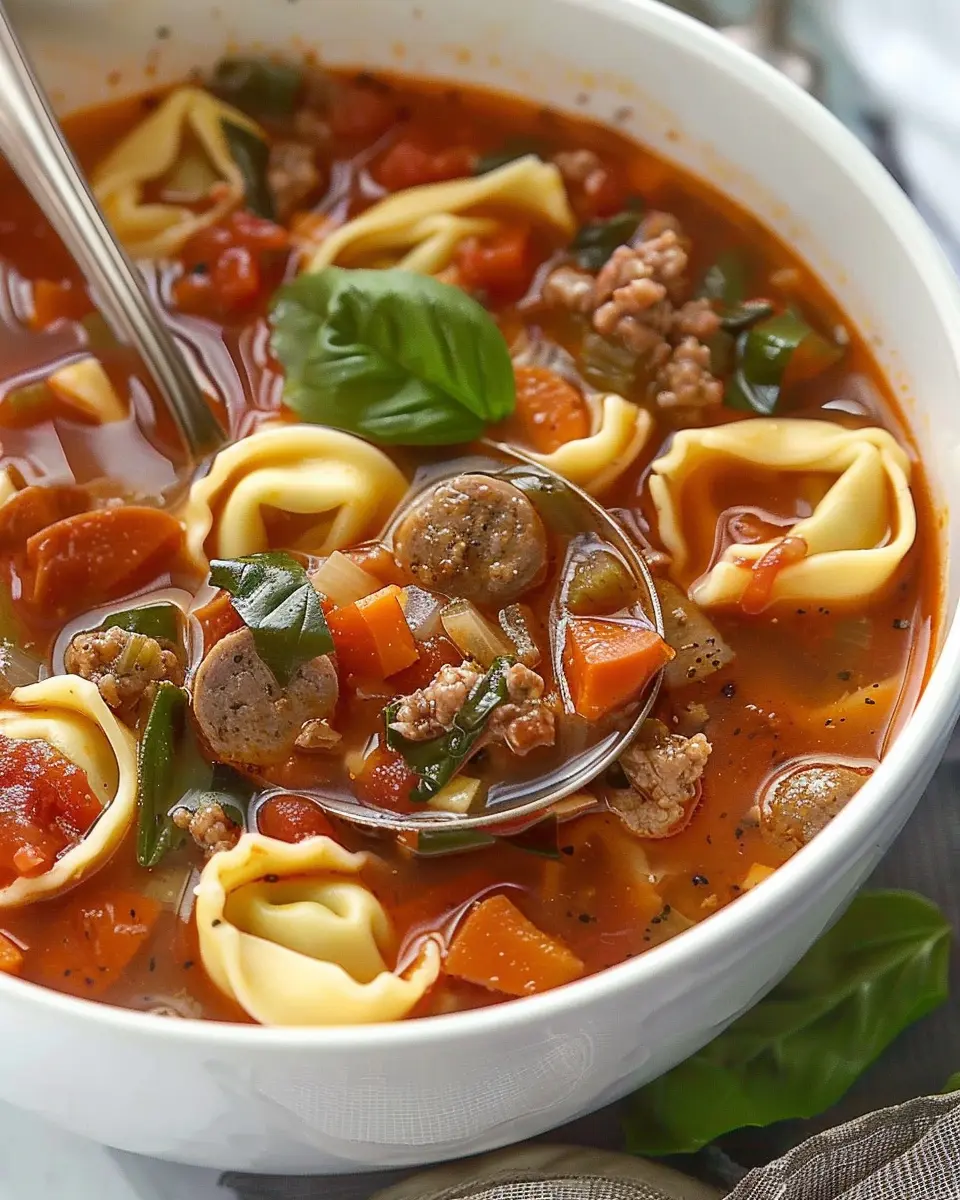 A warm and comforting soup enriched with Italian flavors, featuring savory sausage and tender tortellini.